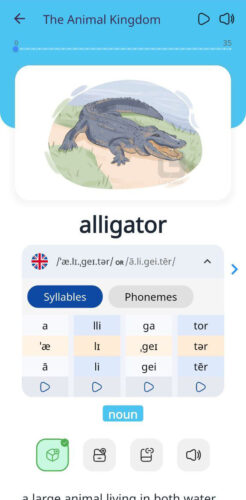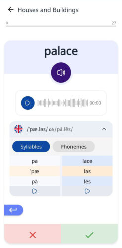 You can tap each syllable to hear it separately or play the entire word slowly to hear how all the sounds connect. This is particularly useful for words with multiple syllables or complex pronunciation patterns that learners often find confusing.